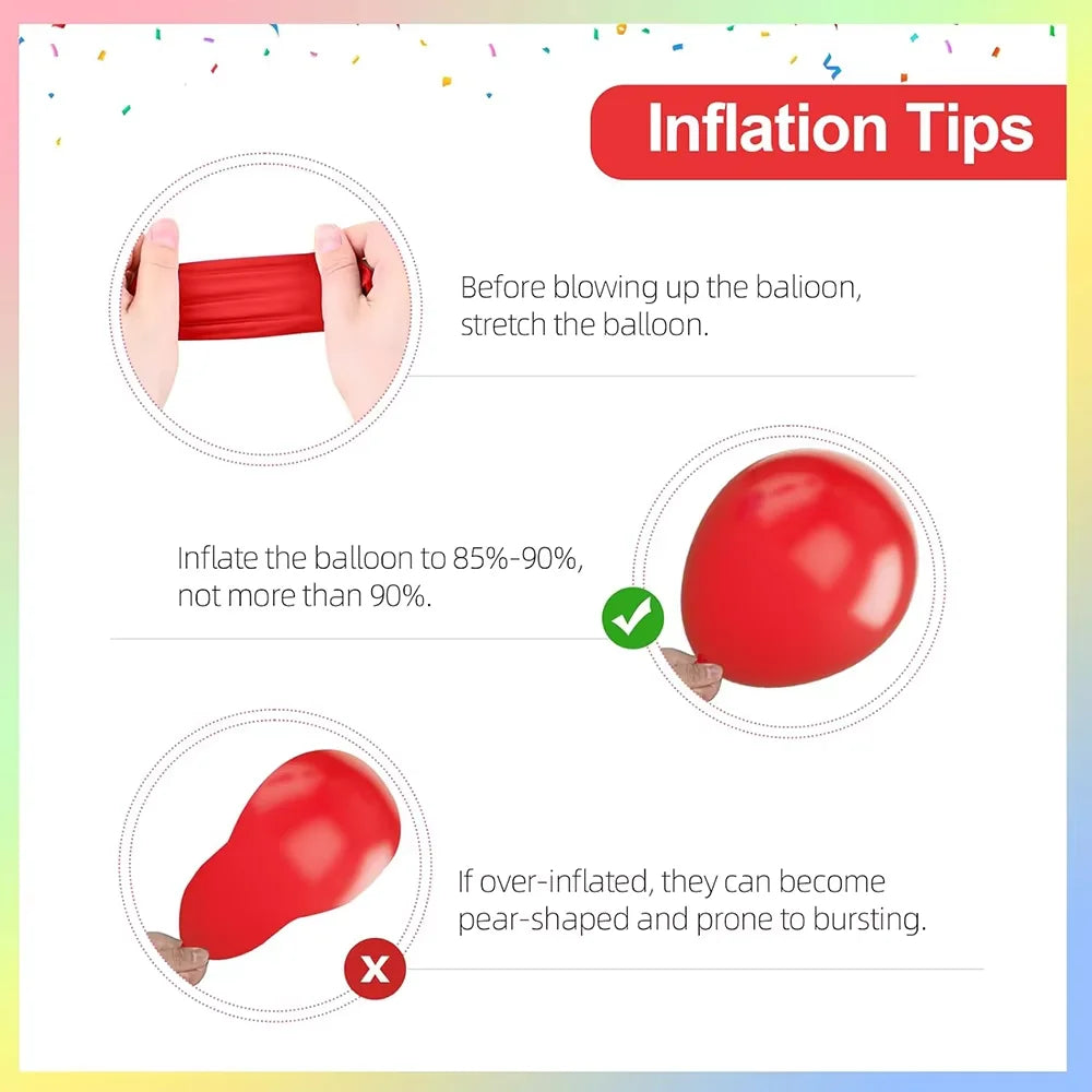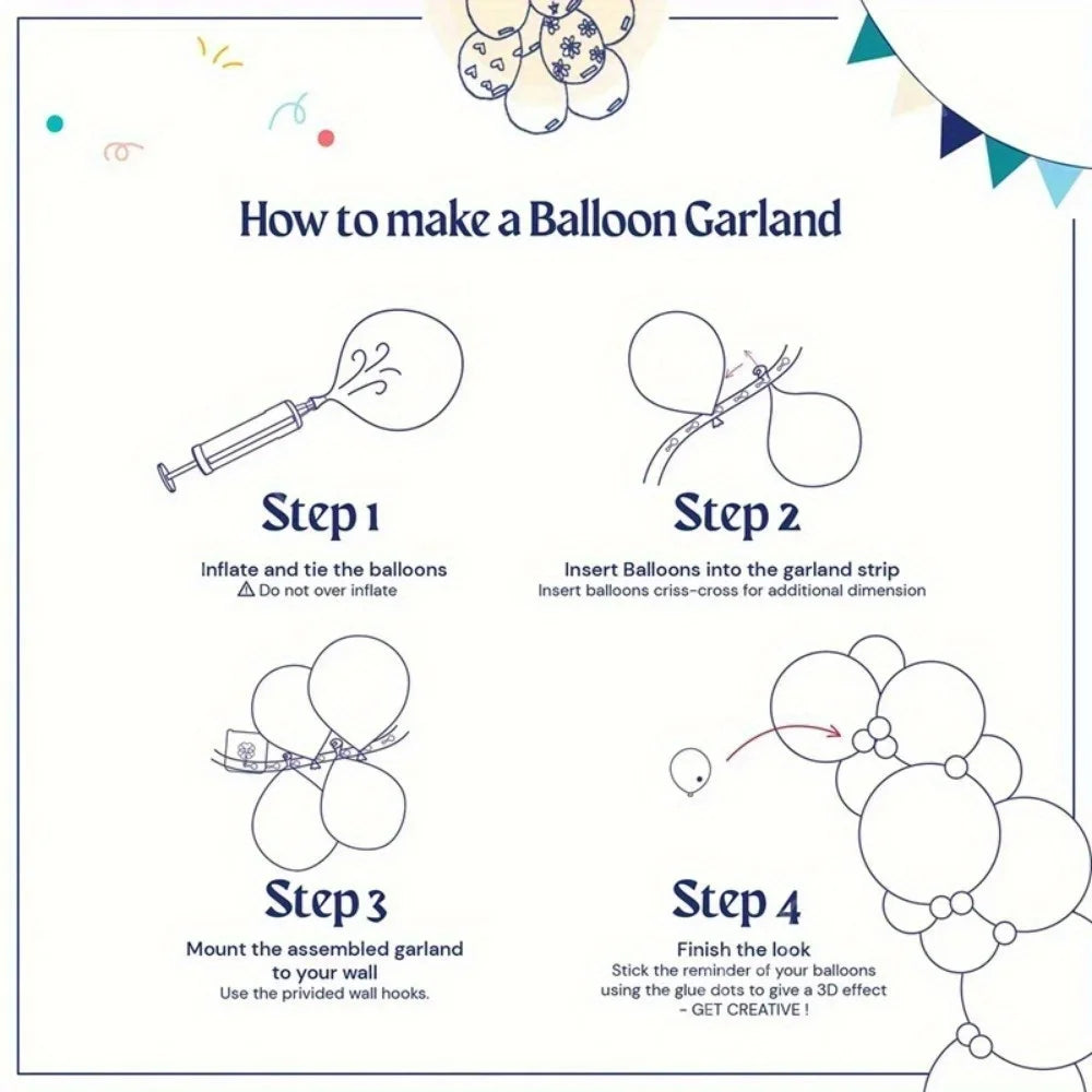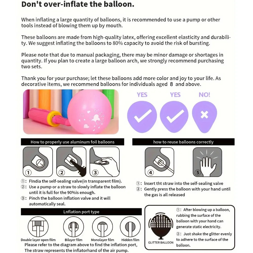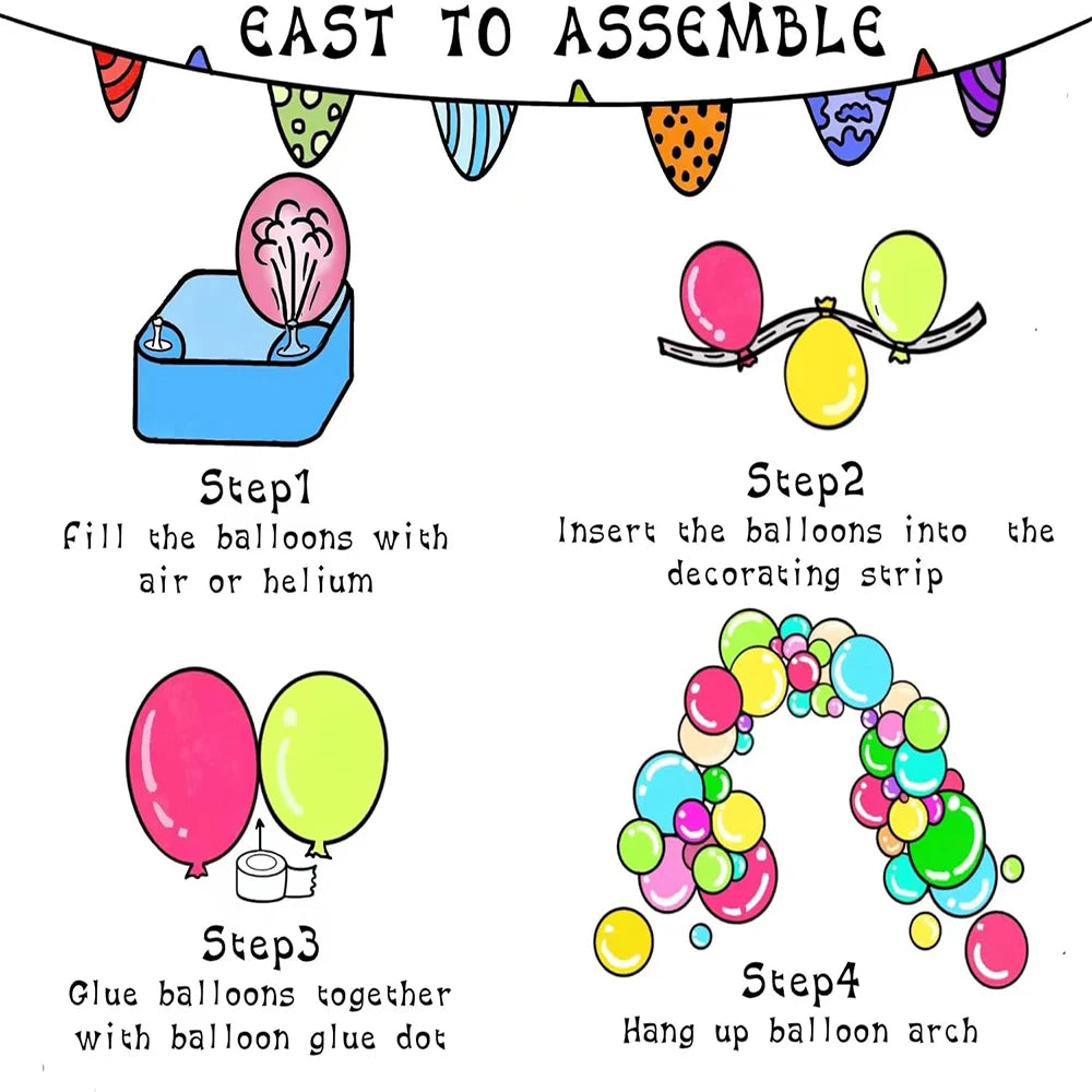 No any experience required! The complete package can make an impressively large decorations in a short amount of time. Ribbons, glue dots, and balloon arch strips are all included in the package. 1. Don't overfill the balloon especially in hot weather. (just fill it to 80% is fine) 2. Thread the balloons alternately through the holes on both sides and add more with glue dots 3. Inflate as shown Premium Quality Won't Let You Dow