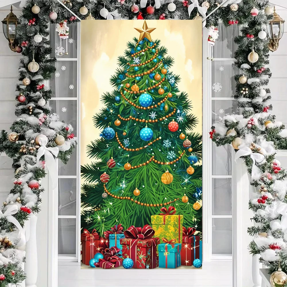 Christmas Outdoor Decorations Xmas Tree Pattern Christmas Door Cover Santa Xmas Elves Backdrop Banner Party House Door Hang