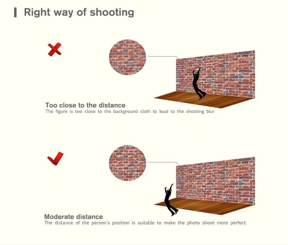 The backdrops need keep distance to take pictures.Also many large size images may seen a littlepixelated. Different lighting will have different shooting effect, you can try to adjust the lights and theappropriate positionto make your photos better.